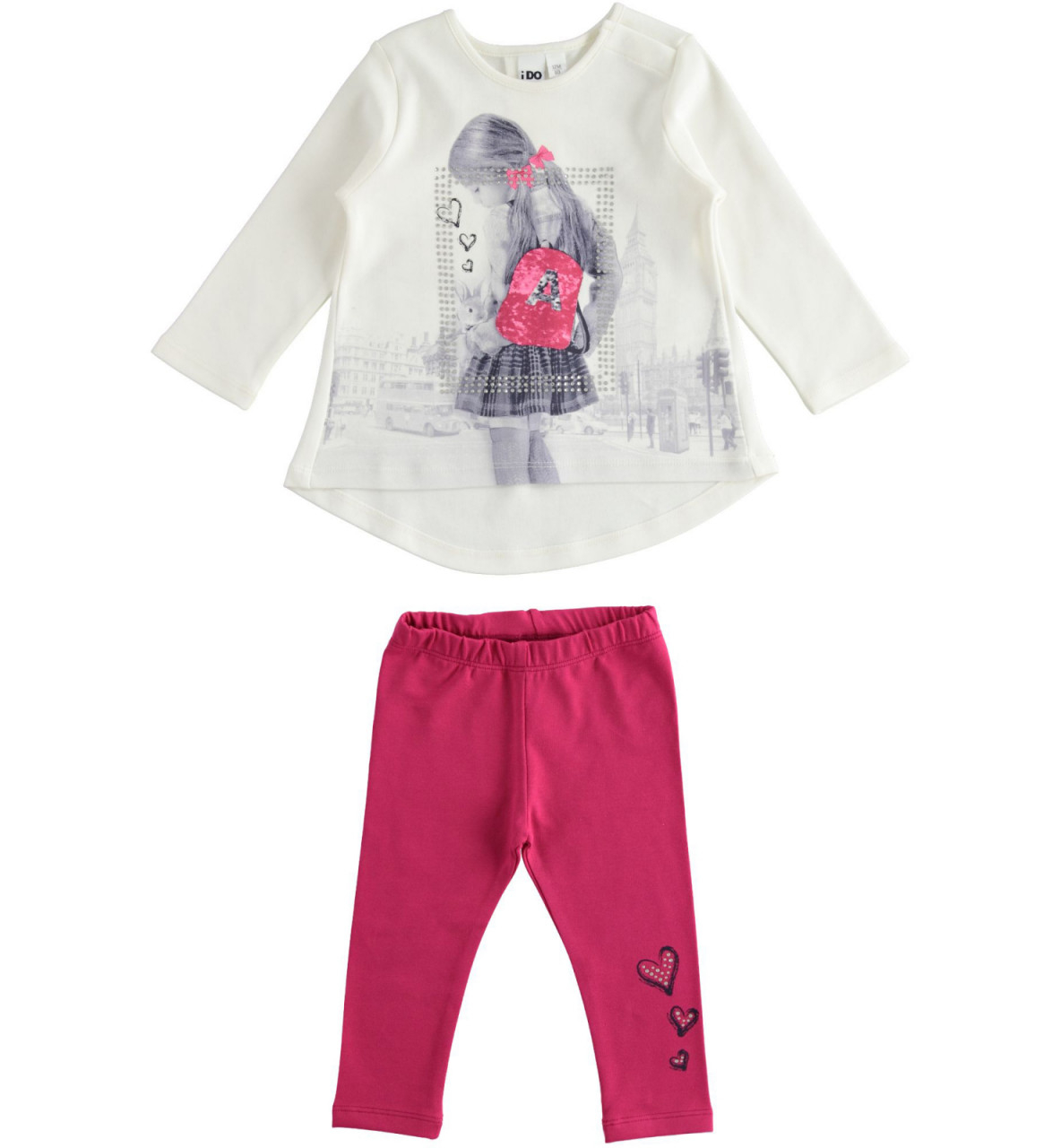 Set 2 piese fetite, tricou cu maneca lunga , asimetric,print fetite cu strasuri aplicate, bumbac 100% si colant roz.Brand iDOMade Italia