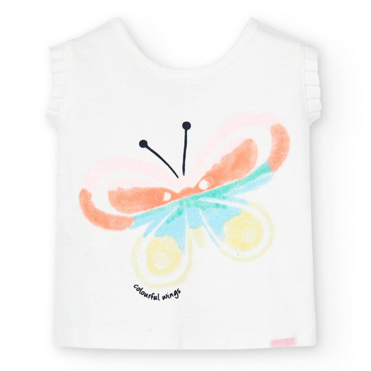 Superb top de vara pentru fetite Boboli , imprimeu fata un fluture multicolor gliterat, spate fancy plisat.Compozitie 58% bumbac, 42% poliesterBrand BoboliMade Spania