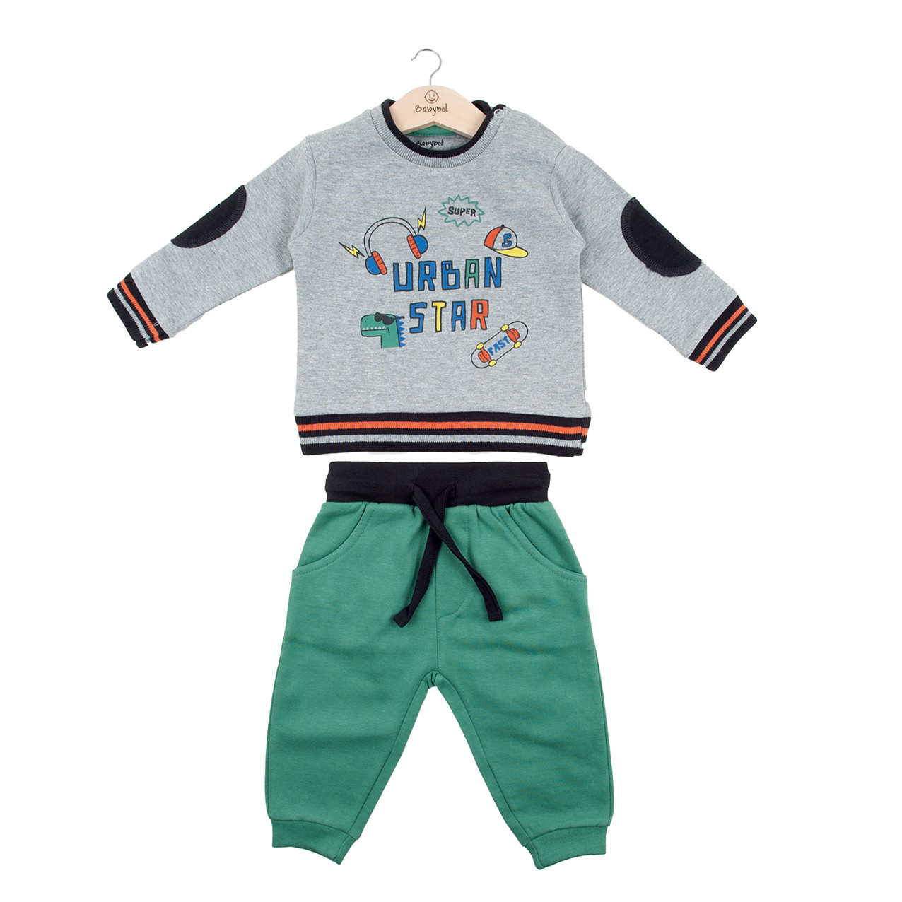 Trening baieti din 2 piese marca Babybol, vatuit la interior, bluza cu maneca lunga, cotiere pe maneci, imprimeu dino pe fata, culoare gri, guler rotund si pantaloni trening de culoare verde cu elastic si siret in talie, manseta elastica, buzunare fata si spate.