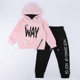 Trening din bumbac format din pantalon negru cu imprimeu pe un picior si hanorac roz cu gluga, fermoar cu deschidere pe partea stanga. 100% bumbac, model trendy.