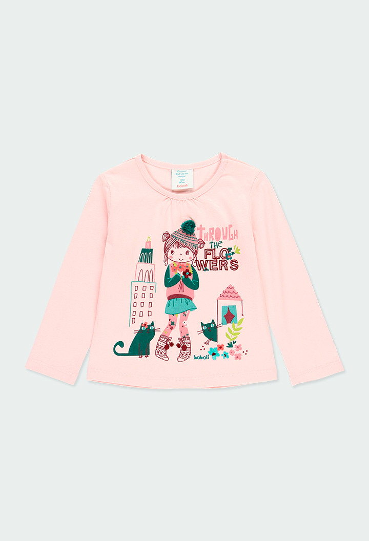 Tricou din bumbac 100% certificat Oeko Tex ( cod QR ) , imprimeu fetita si floricele brodate, capse pe umar pentru o imbracare usoara, guler rotund, rzo.Brand Babybol Spania