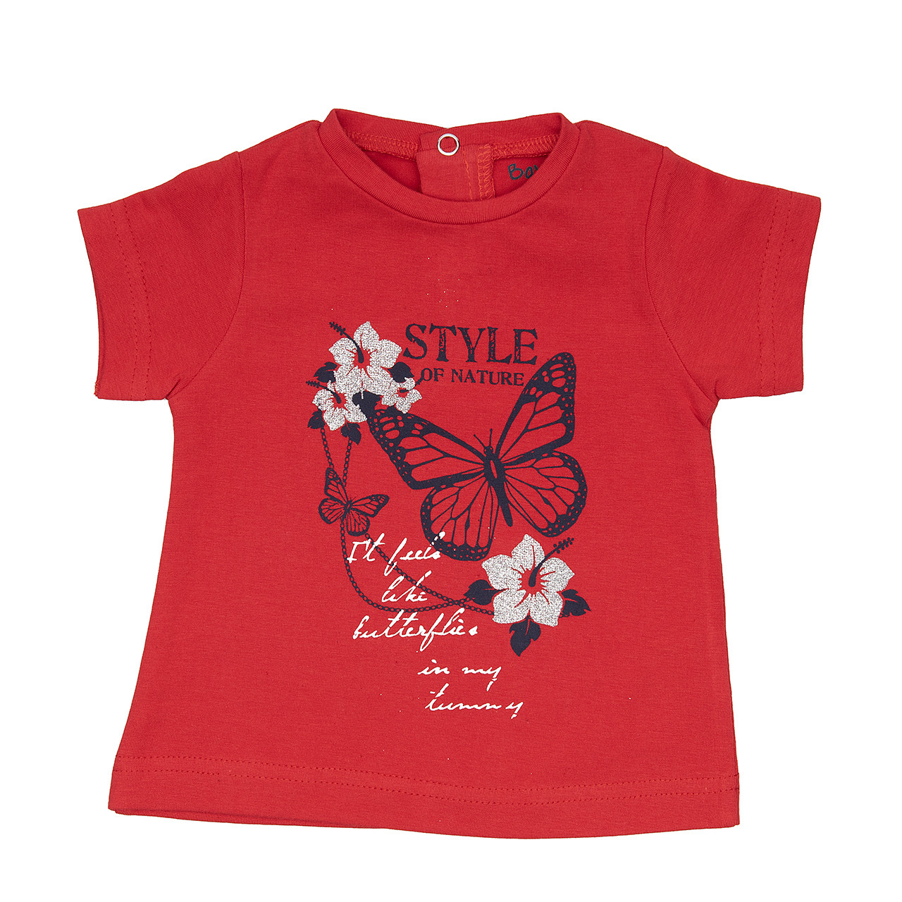 Tricou fete maneca scurta din bumbac , imprimeu fluture si flori gliterate, culoare rosie, brand Babybol.Compozitie: 95%bumbac,5%elastanBrand Babybol