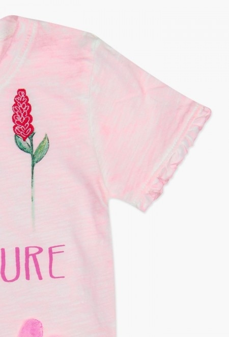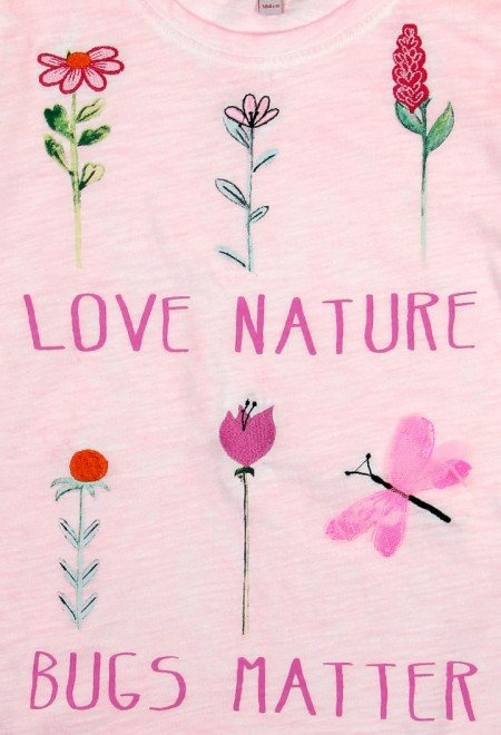 Tricou fete de la Boboli, materialul folosit este bumbac foarte fin , cu aplicatii florale pe fata. Acest material a fost supus unui proces vopsire care ii ofera un aspect unic. Culorile folosite sunt pe baza de apa , nonalergice in contact cu pielea copilului. Face parte din colectia LOVE NATURE"