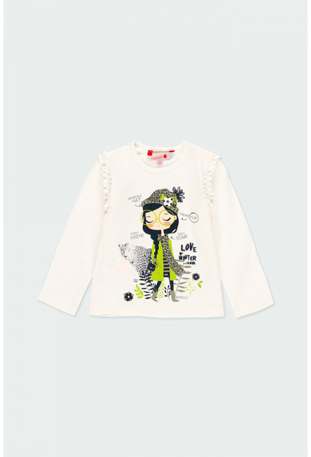 Tricou fetite maneca lunga din bumbac fin, print grafic multicolor pe fata, volanase la umar.