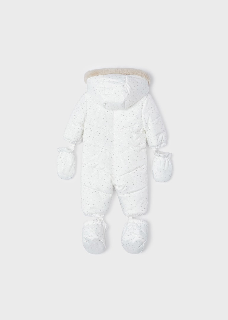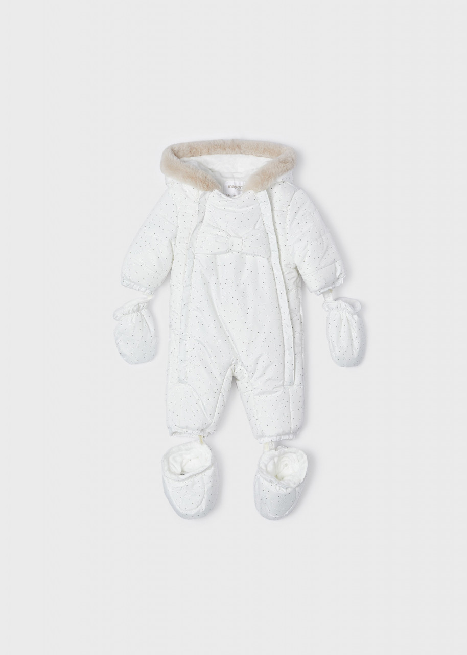 Salopeta iarna bebe fetita, alb cu picatele maro, funda aplicata fata, deschidere cu fermoar pe fata, gluga cu blanita, botosei si manusi detasabile.