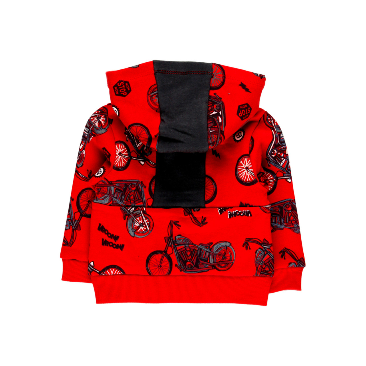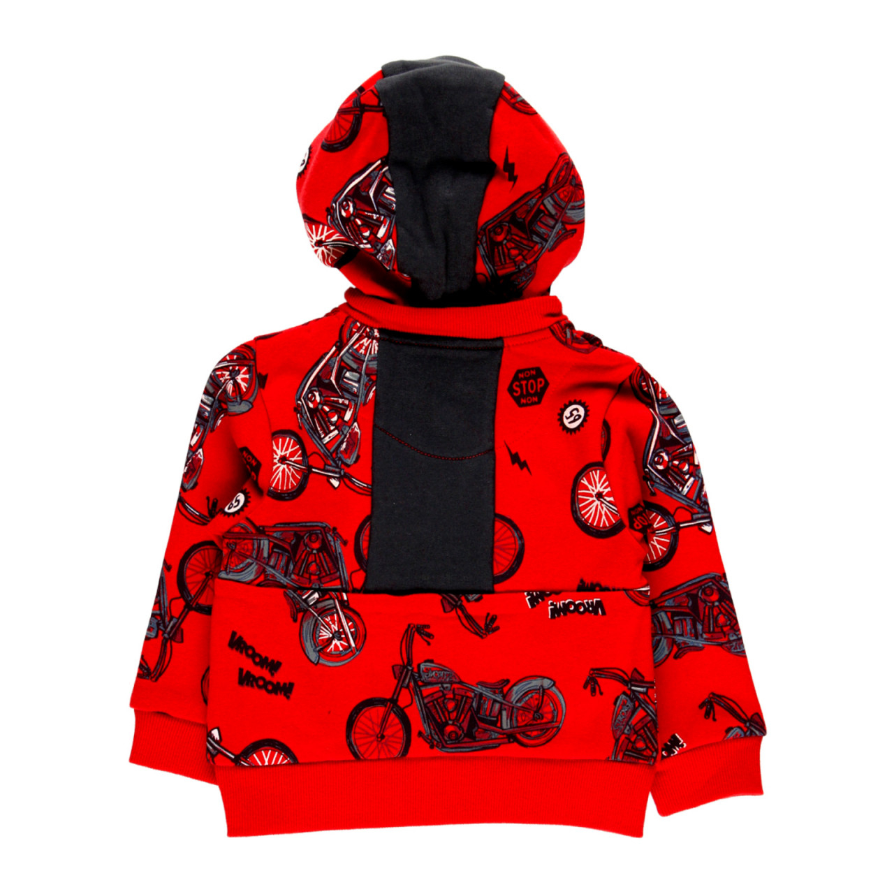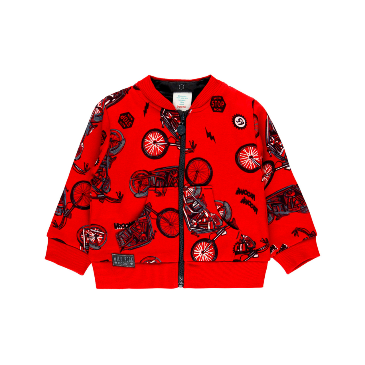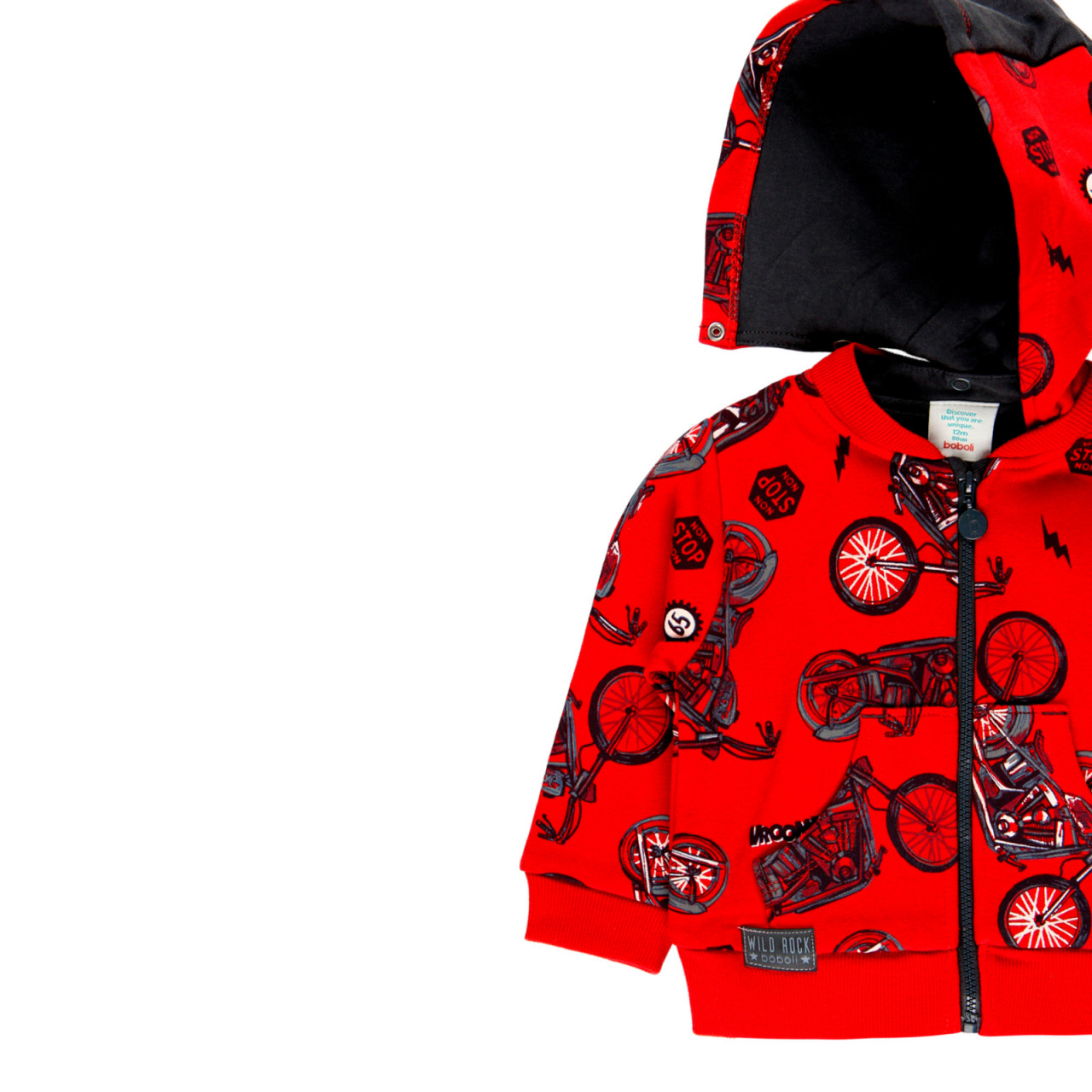 Hanorac din bumbac cu gluga detasabila pentru baiat Boboli, imprimeu motociclete pe fond rosu,buzunare laterale,putin vatuit la interior,inchidere cu fermoar, gluga detasabila.Compozitie : 100% bumbacBrand Boboli Spania