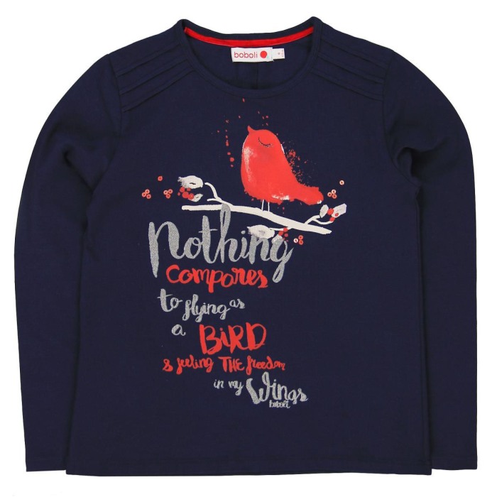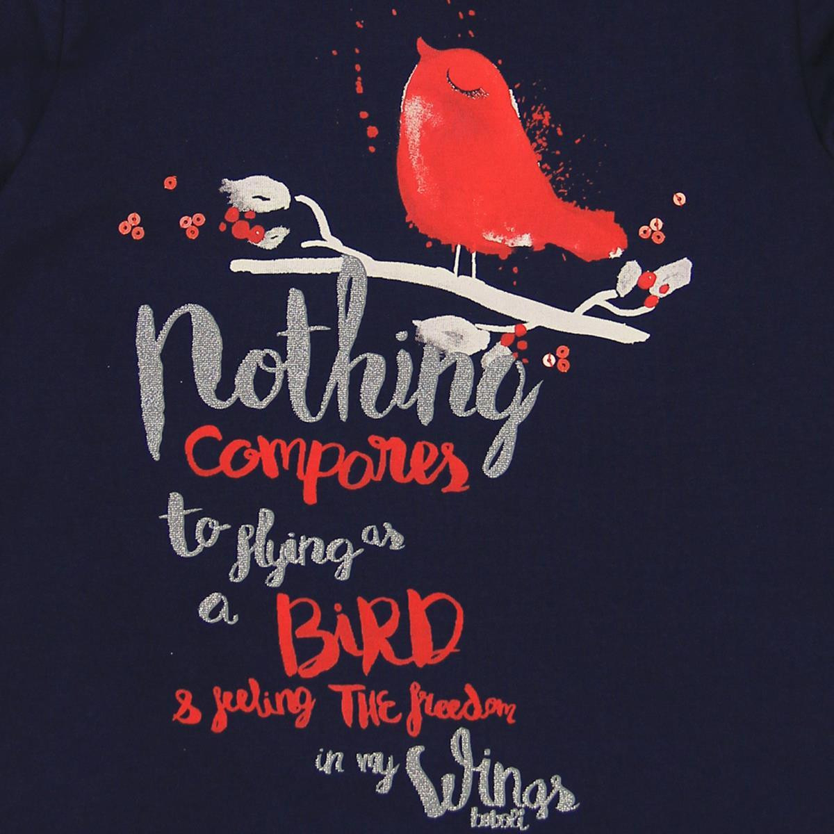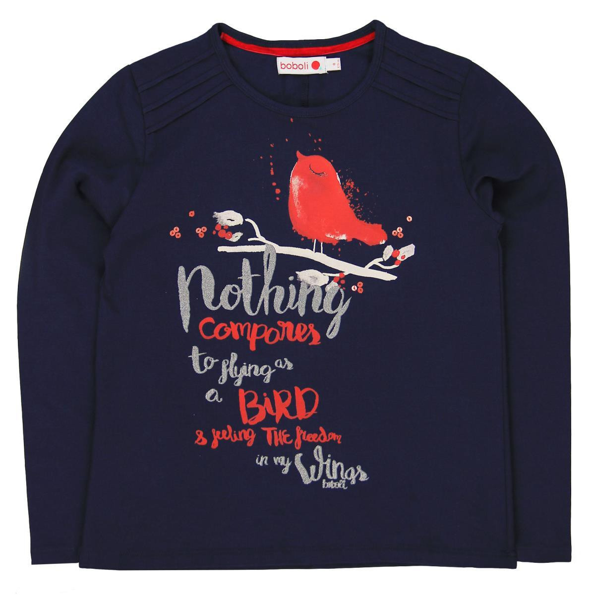 Tricou fete Boboli, cu maneca lunga din bumbac , print pasari pe fata, guler rotund, material moale si placut. Compozitie : 95% bumbac, 5% elastan Made Spania