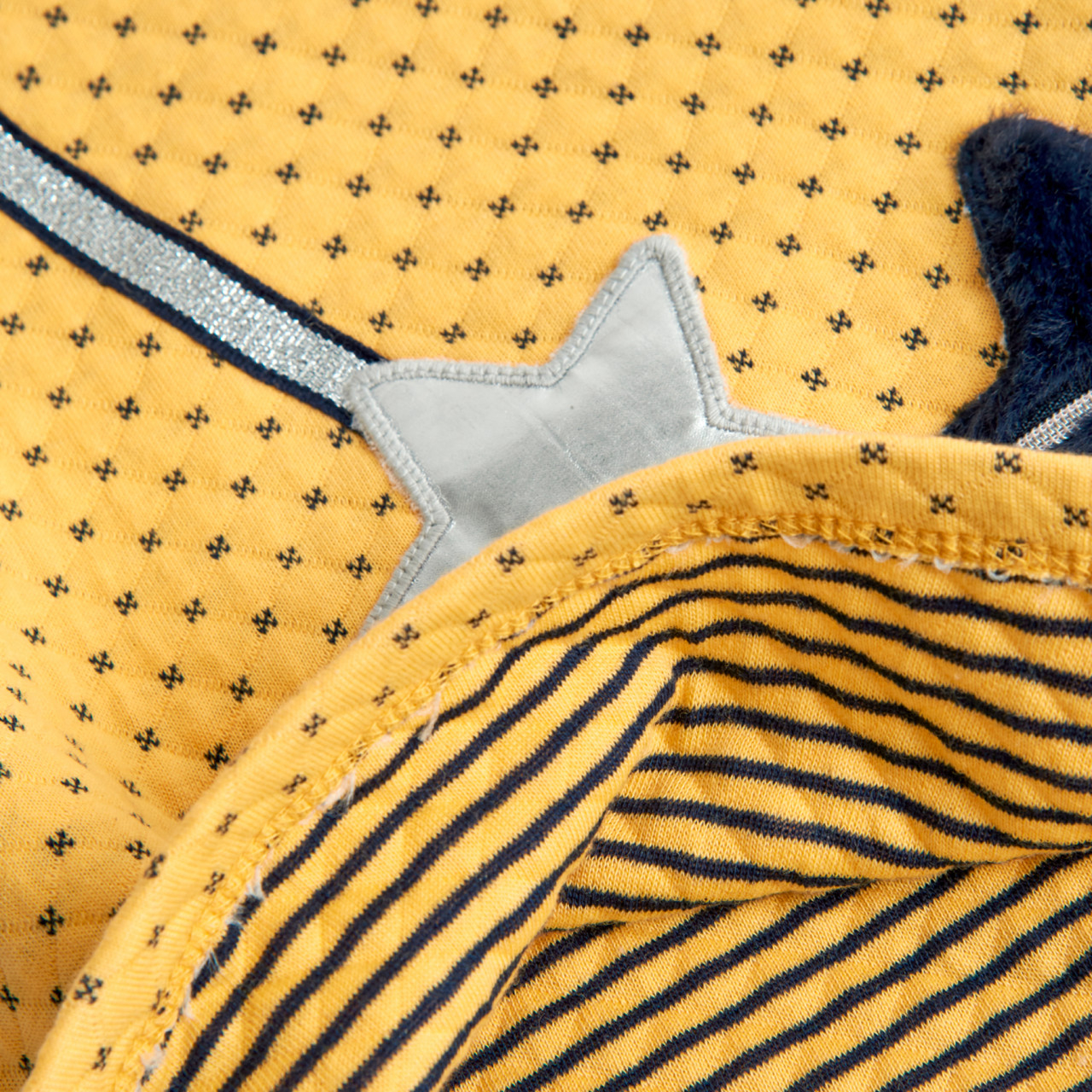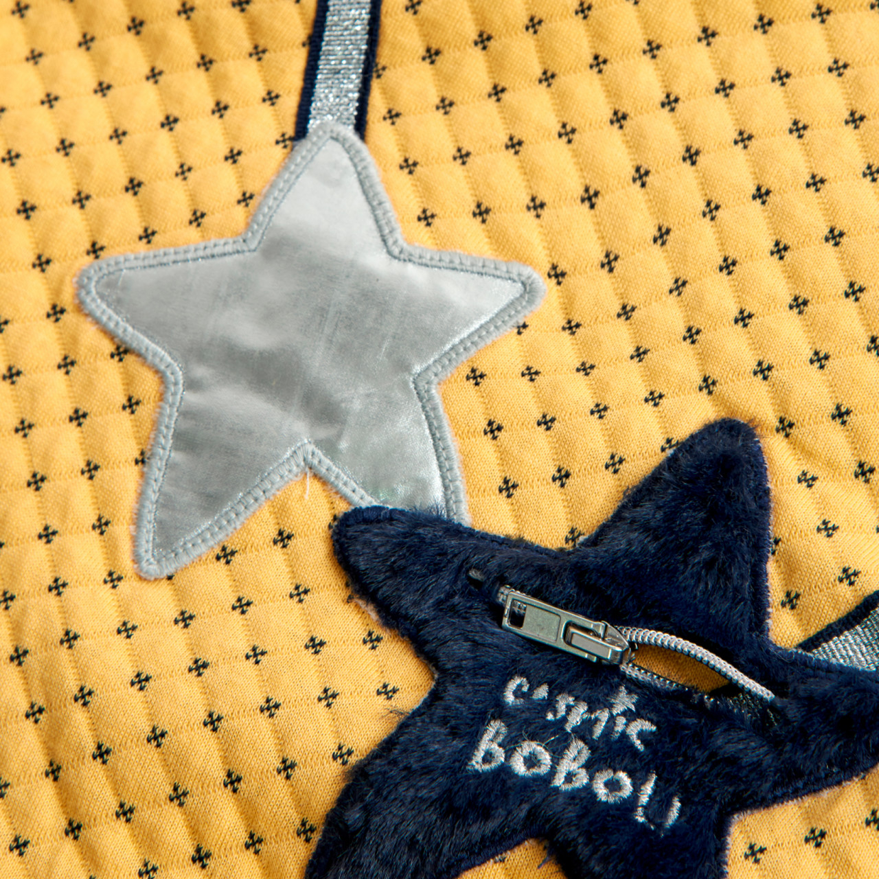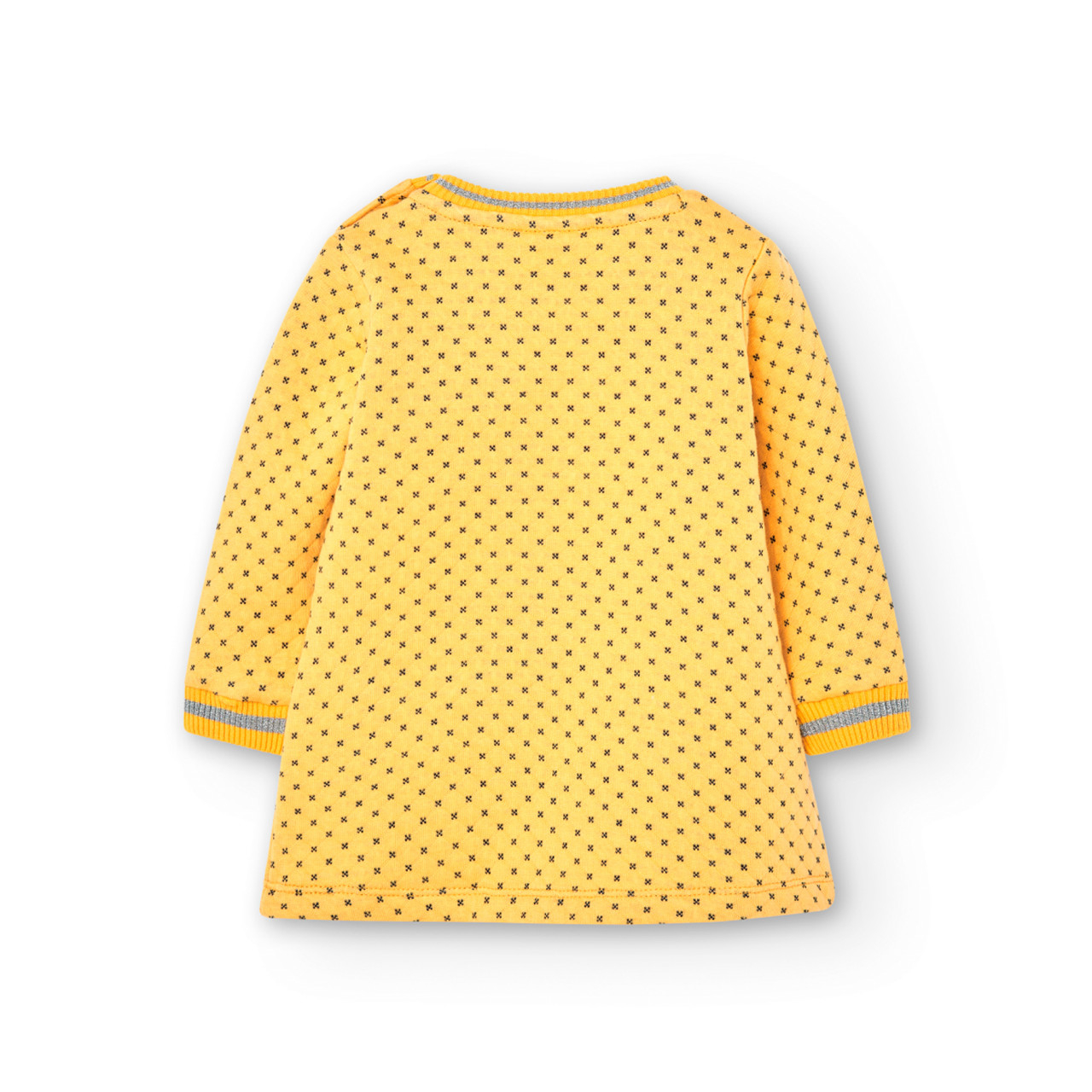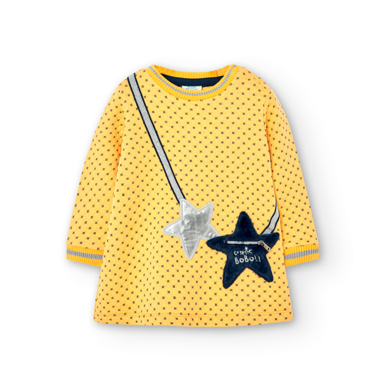 Rochie casual fetite din bumbac dublat, galbena cu steluta argintie si blanita aplicata.