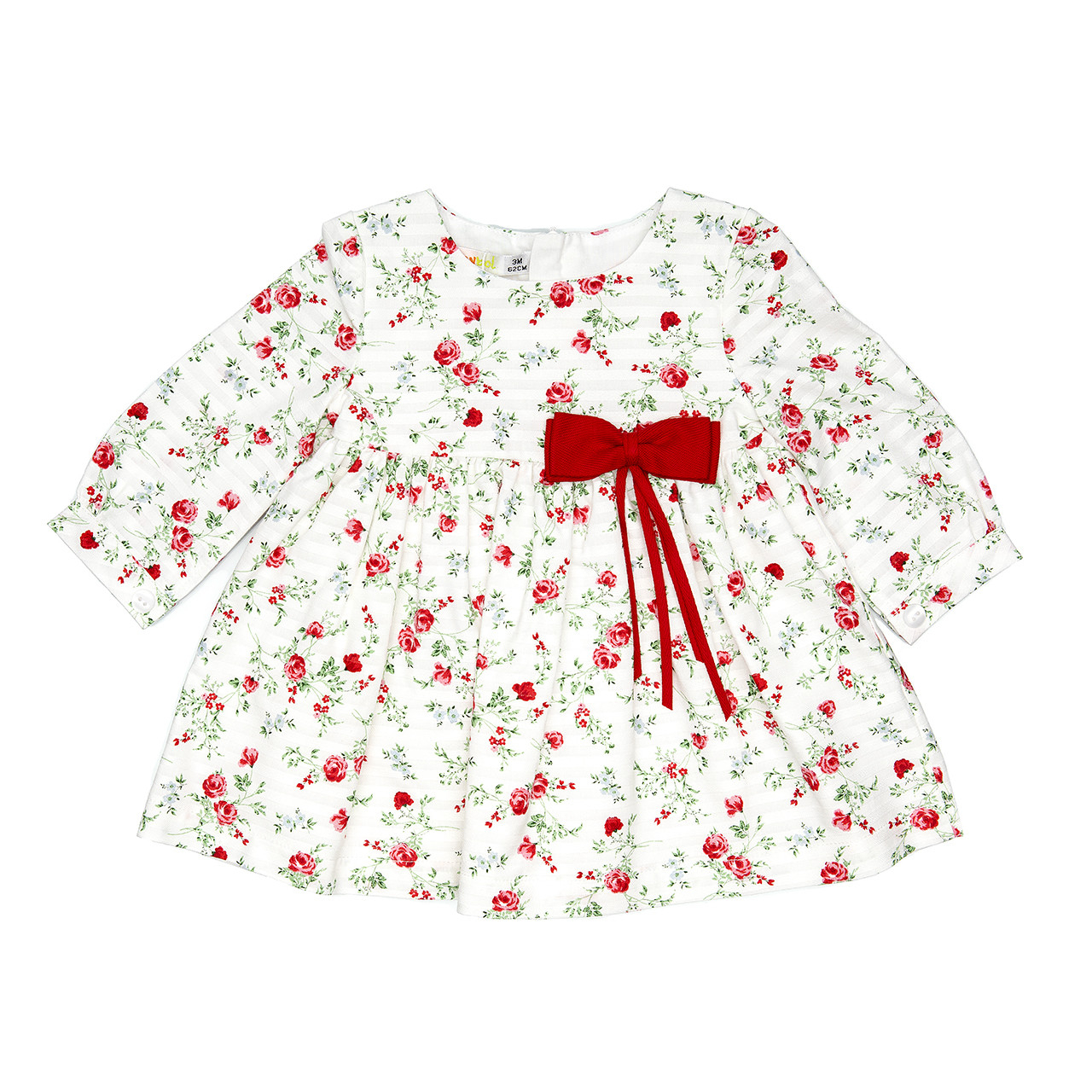 Rochita ivoire cu maneca lunga din tesatura placuta de bumbac cu imprimeu marunt de trandafirasi cu frunze. O funda eleganta decoreza rochia. Tesaturile folosite de producatorul spaniol Babybol asigura un comfort la purtare si o purtabilitate indelungata datorita tesaturii.