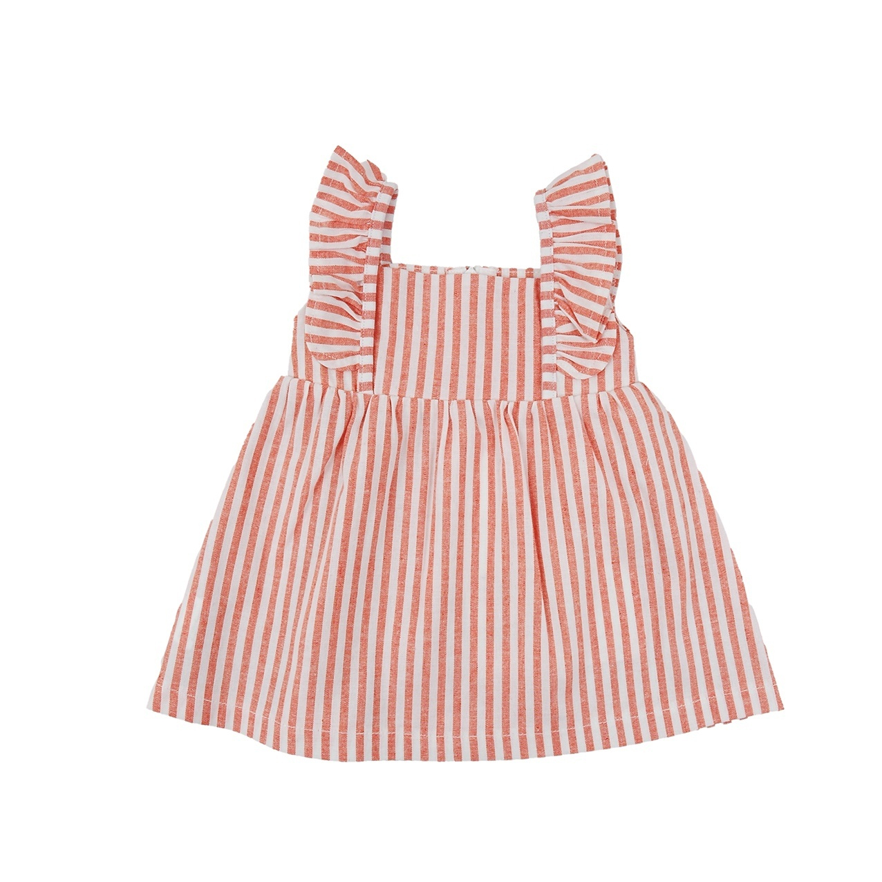 Rochie lejera fete din bumbac cu bretele, dungi portocalii, volanase la bretele, inchidere cu fermoar.