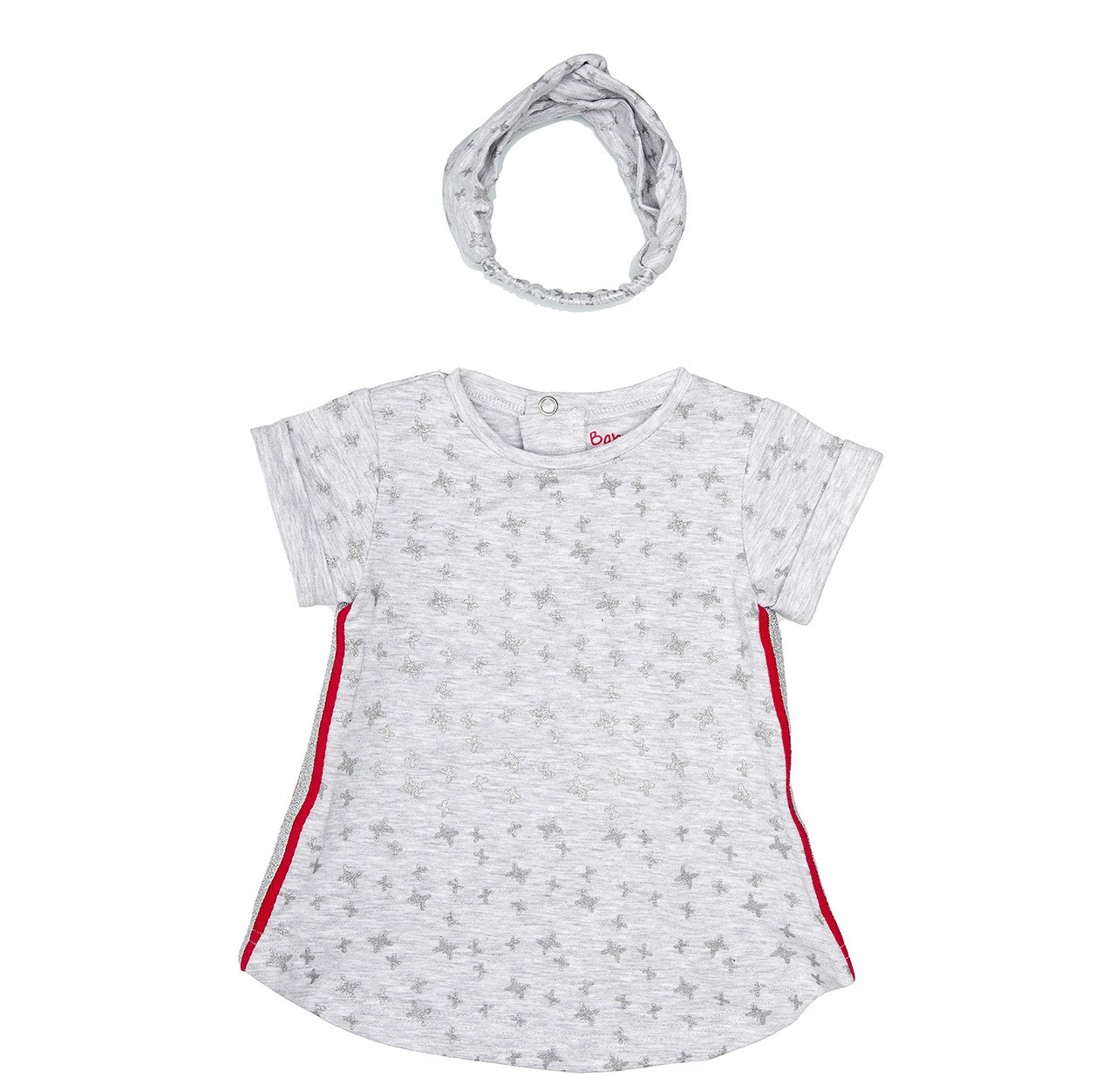 Rochie sport pentru fetite din bumbac indian cu bandana cu elastic din acelasi material inclusa in pachet, maneca scurta, imprimeu fluturasi gliterati pe toata suprafata, pe laterale vipusca gliterata combinata cu benzi siclam.