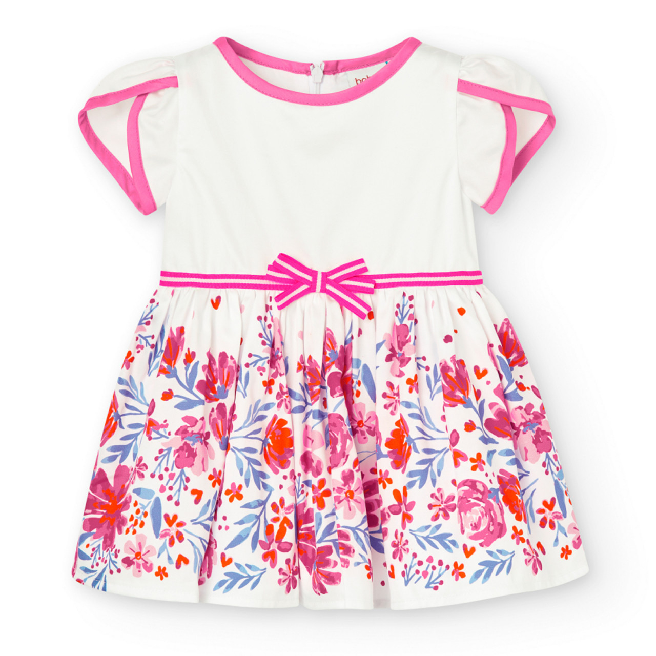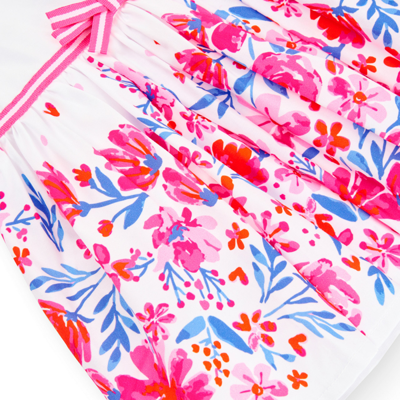 Rochie superba pentru fetite din saten, gama CHIC Boboli, imprimeu floral cu fundita in talie, jupa cu tulle si captuseala din bumbac.Made Spania