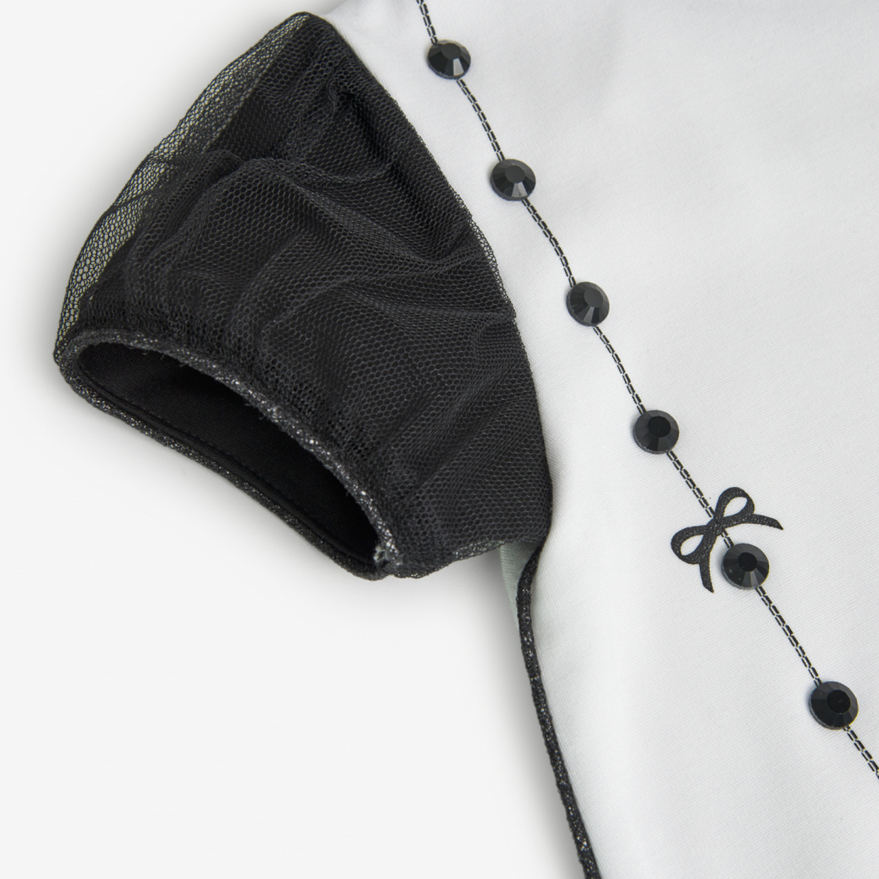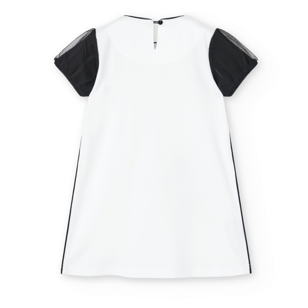 Aceasta este o rochie de fată din tricot roma, perfectă pentru sezonul de primăvară și vară. În alb și negru, are un imprimeu vesel care adaugă o notă de distracție. Gâtul rotund și mânecile scurte o fac confortabilă pentru a fi purtată în fiecare zi. Este confecționată din material tricotat, cunoscut pentru durabilitatea și moliciunea sa. Rochia are o închidere cu nasturi pentru o îmbrăcare ușoară. Disponibilă în mărimi cuprinse între 4 ani și 16 ani, această rochie este o alegere versatilă pentru orice fată.