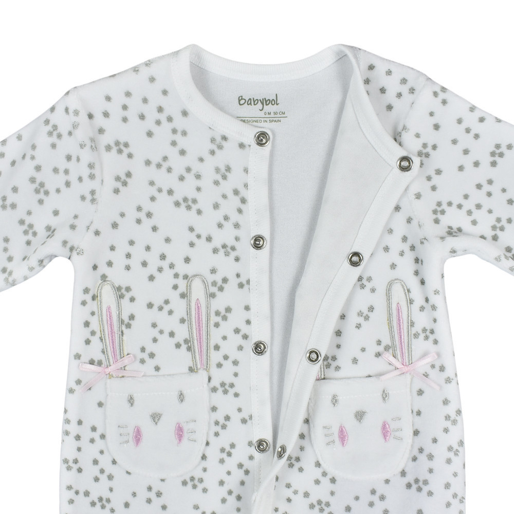 Superba salopeta pentru fetite din bumbac catifelat, inchidere pe fata cu capse, buzunare brodate cu un haios cap de iepuras.