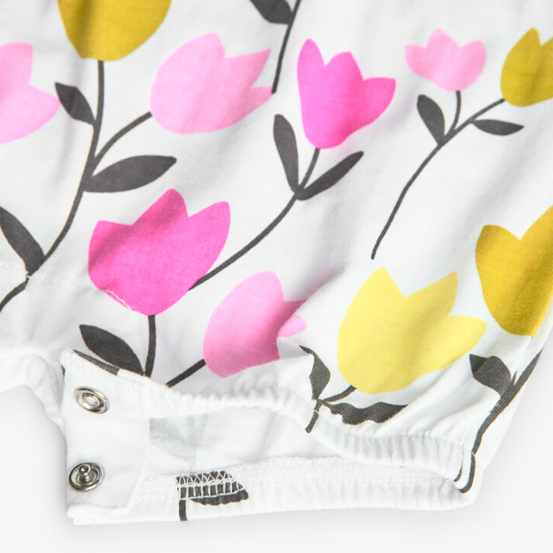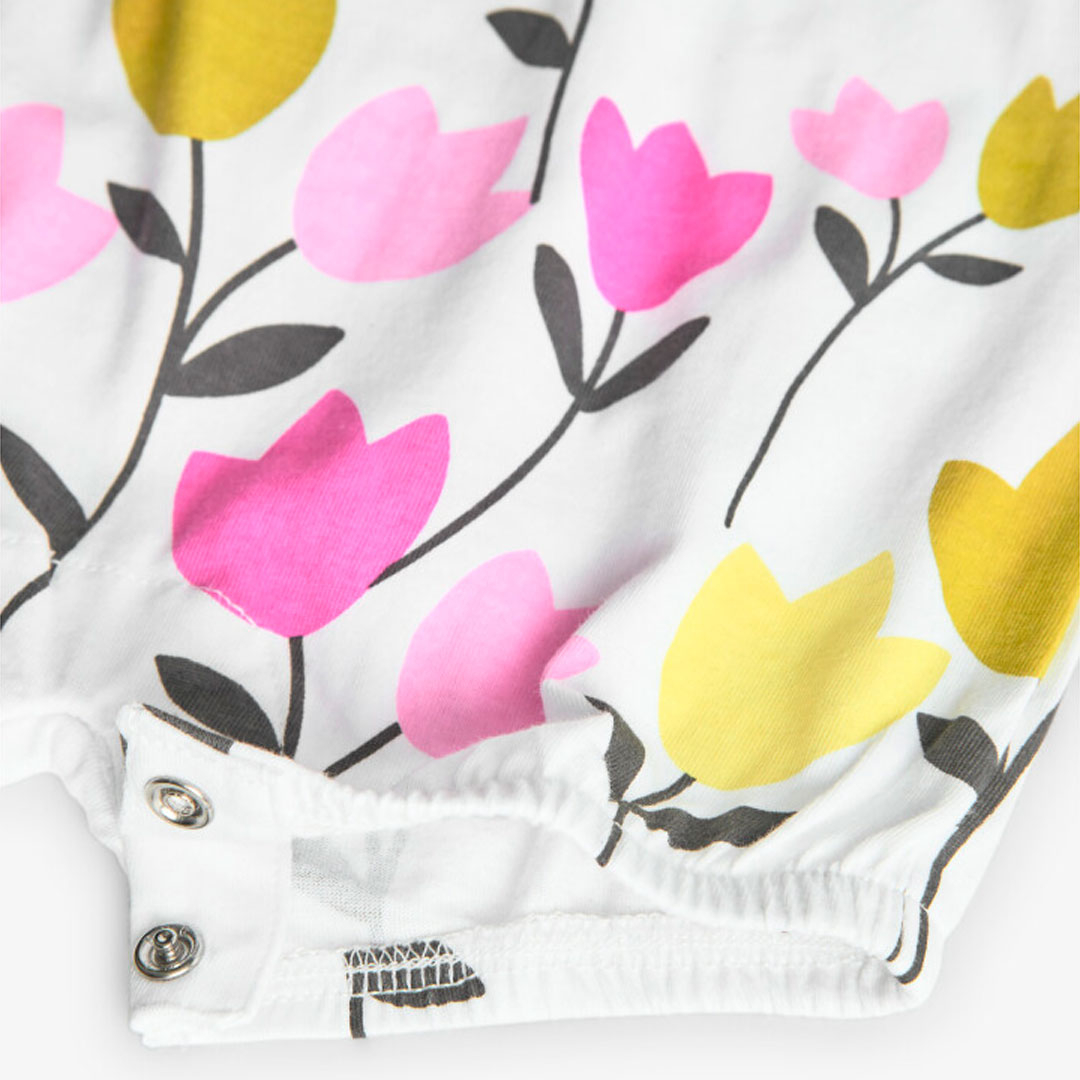 Salopeta maneca scurta bebe fetita, bumbac better cotton, capse pe umar si intre picioare pentru o schimbare usoara, aplicatie fluture, imprimeu lalele, alb, brand Boboli