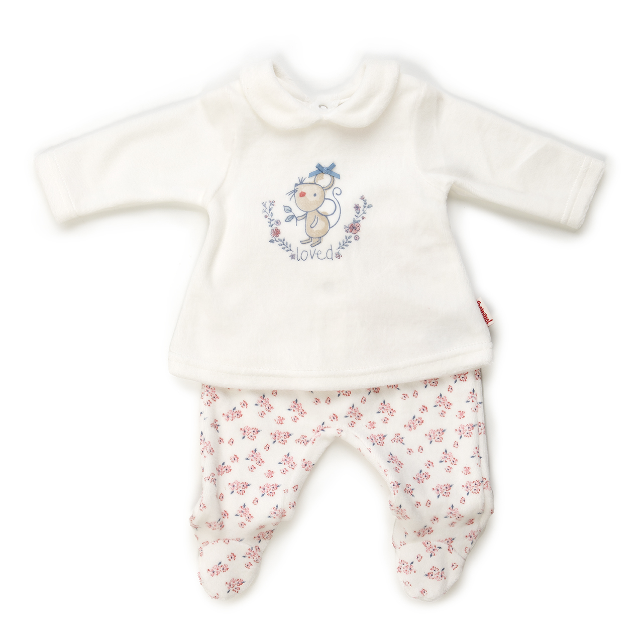 Set bebe fetita din bumbac catifelat, compus din bluza cu maneca lunga cu inchidere pe spate cu capse, imprimeu soricel pe fata si pantalonasi cu botosei, imprimeu flori, banda elastica in talie. Brand Babybol Made Spania