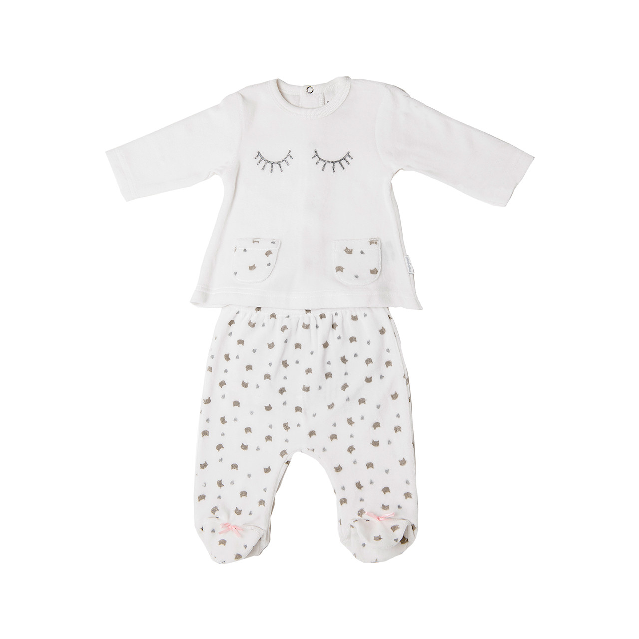 Set 2 piese din bumbac catifelat pentru bebe fetite, compus din bluza cu inchidere pe spate cu capse si pantalon cu botosei, banda elastica in talie, imprimeu vesel. Produsul cine ambalat in cutie Babybol.