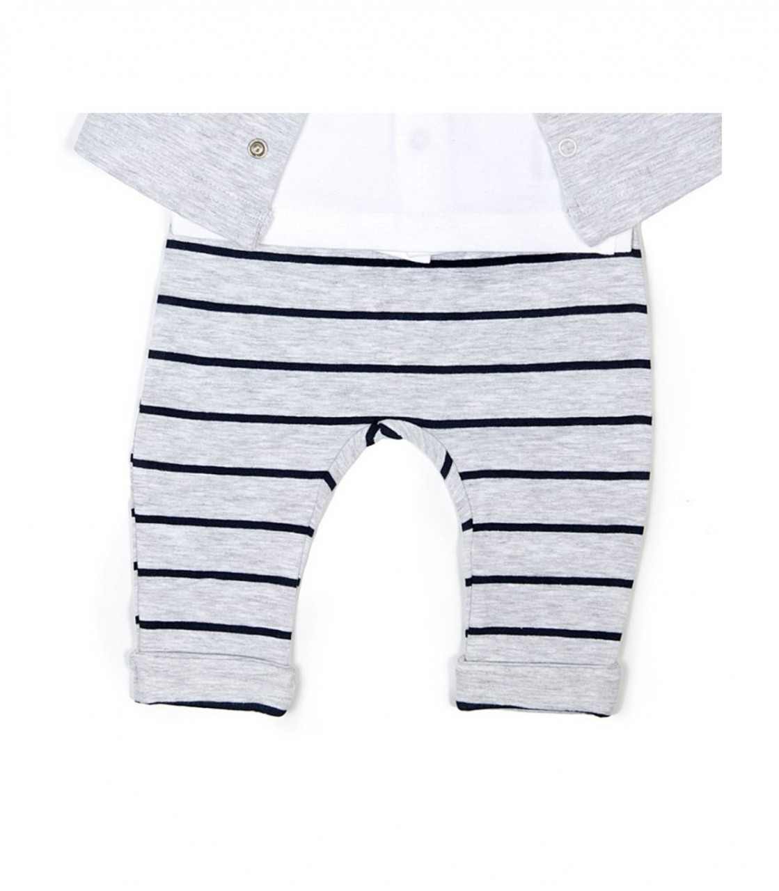 Costumas din bumbac din 3 piese pentru bebe baiat de la Babybol. Contine jacheta cu maneca lunga , inchidere cu capse tricou cu maneca scurta si pantaloni lungi cu dungi bleumarin pe fond gri.