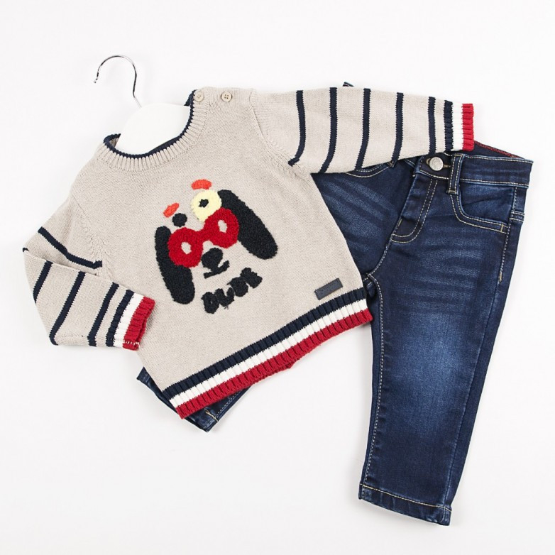 Set 2 piese baiat , pulover tricot cu pantalon jeans,Babybol