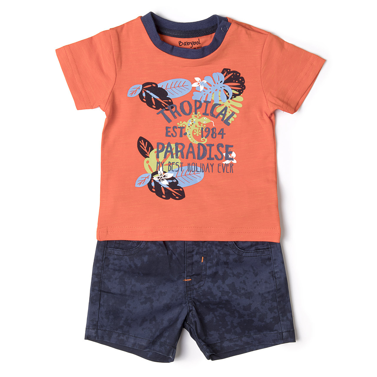 Set de vara pentru baieti Babybol! Contine tricou cu maneca scurta, imprimeu tropical paradise" si pantalon scurt bleumarin , reglabil in talie.Compozitie : 100% bumbacMade Spania