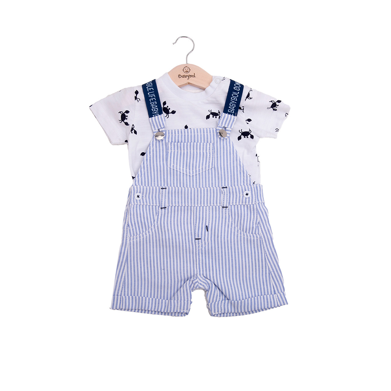 Set vara bebe baiat Babybol, contine salopeta din bumbac si in cu bretele, dungi bleu si tricou maneca scurta alb cu imprimeu raci.Brand Babybol Barcelona