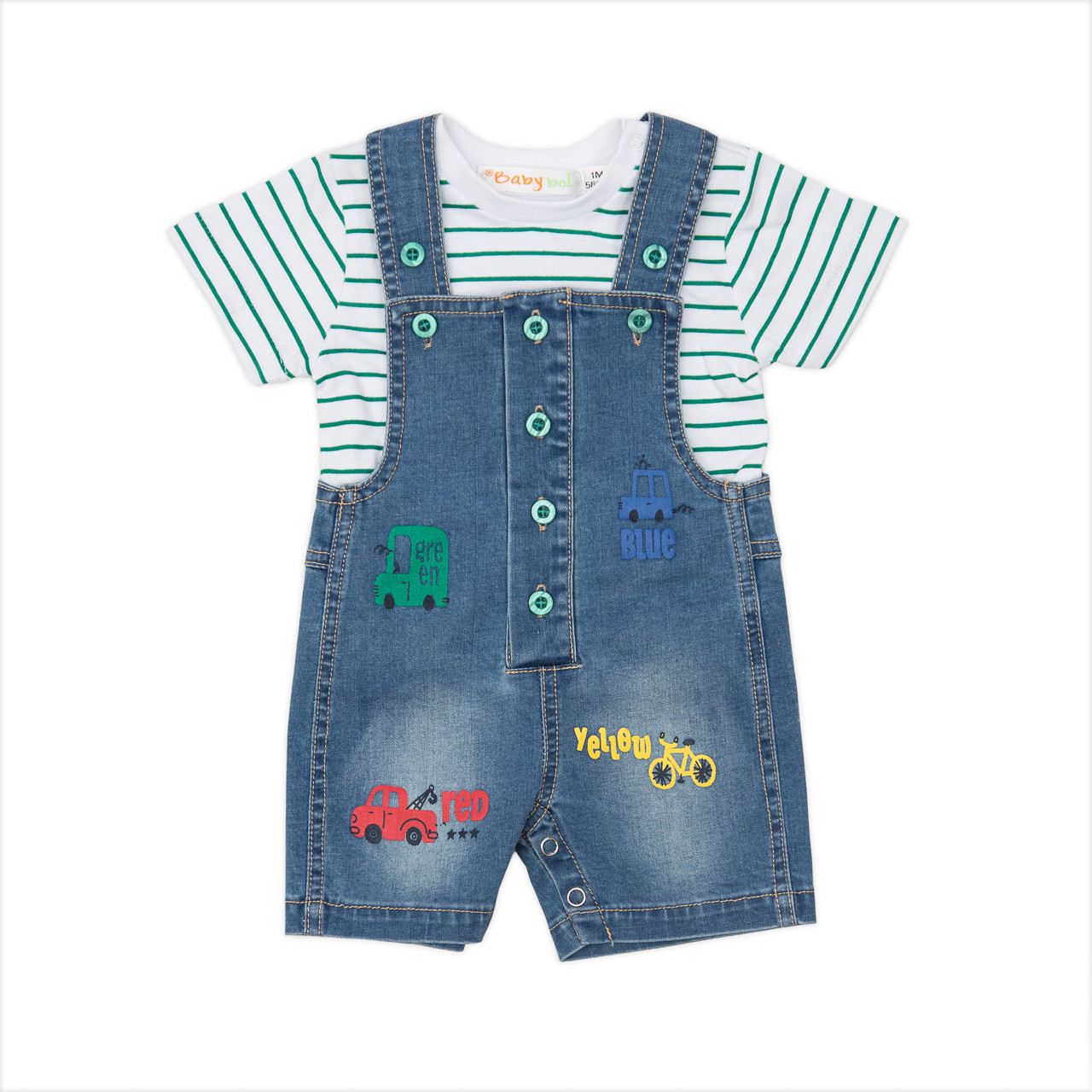 Salopeta blugi bebe baiat cu bretele , imprimeu masinute si tricou cu dungi verzi maneca scurta.