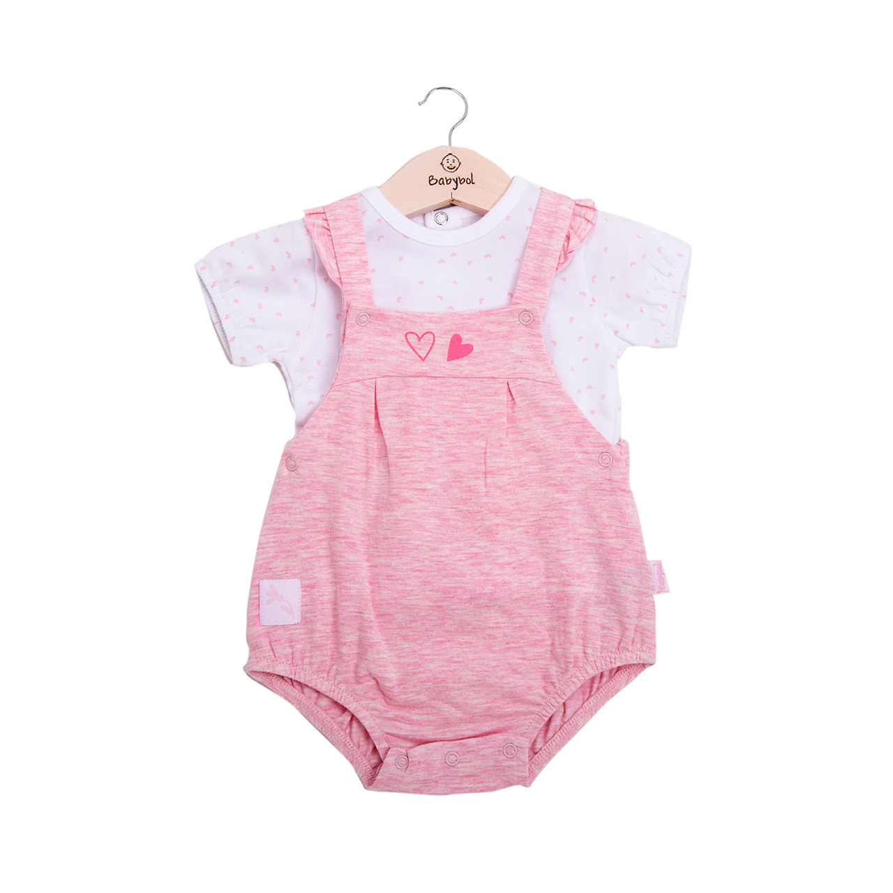 Set bebe fetita Babybol, salopeta cu bretele roz si tricou maneca scurta alb cu imprimeu inimioare, inchidere cu capse.Compozitie :95% bumbac,55 elastanBrand Babybol