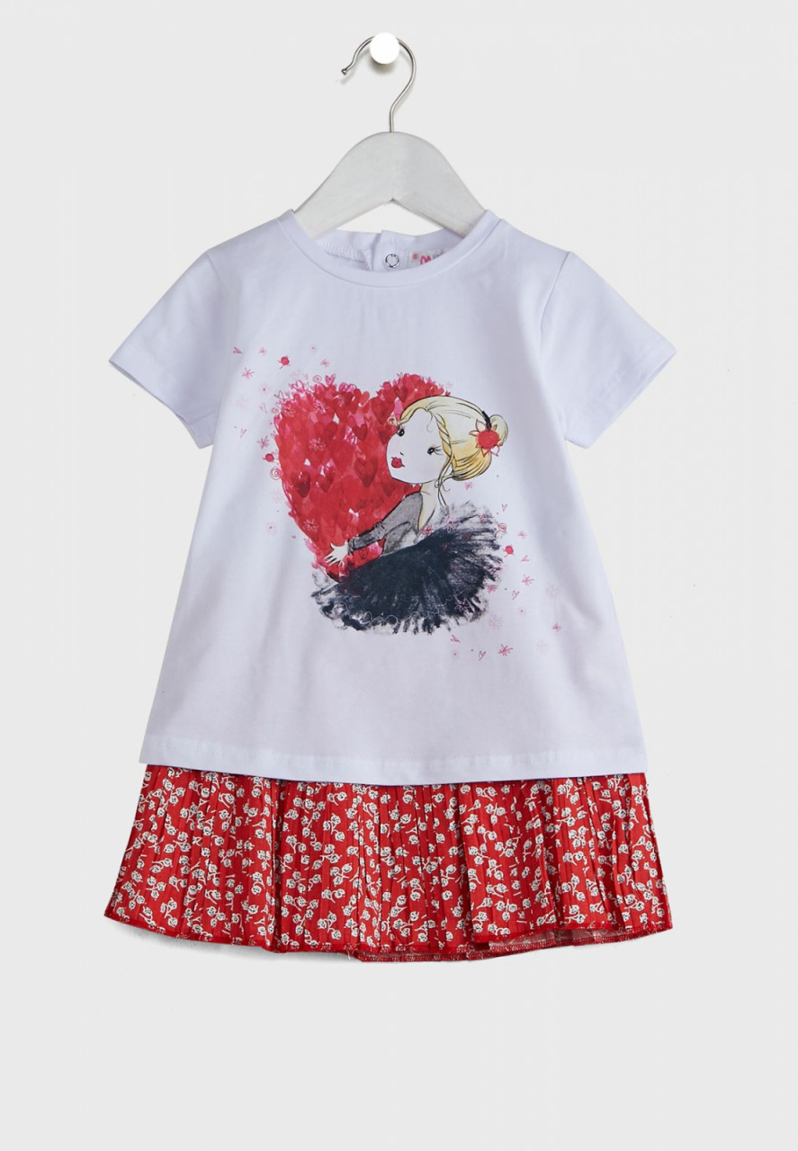 Superb costum din 2 piese pentru fetite din bumbac Babybol. Contine tricou maneca scurta cu imprimeu fetita pe fata si fusta plisee rosie , captuseala bumbac, banda elastica in talie.Brand Babybol