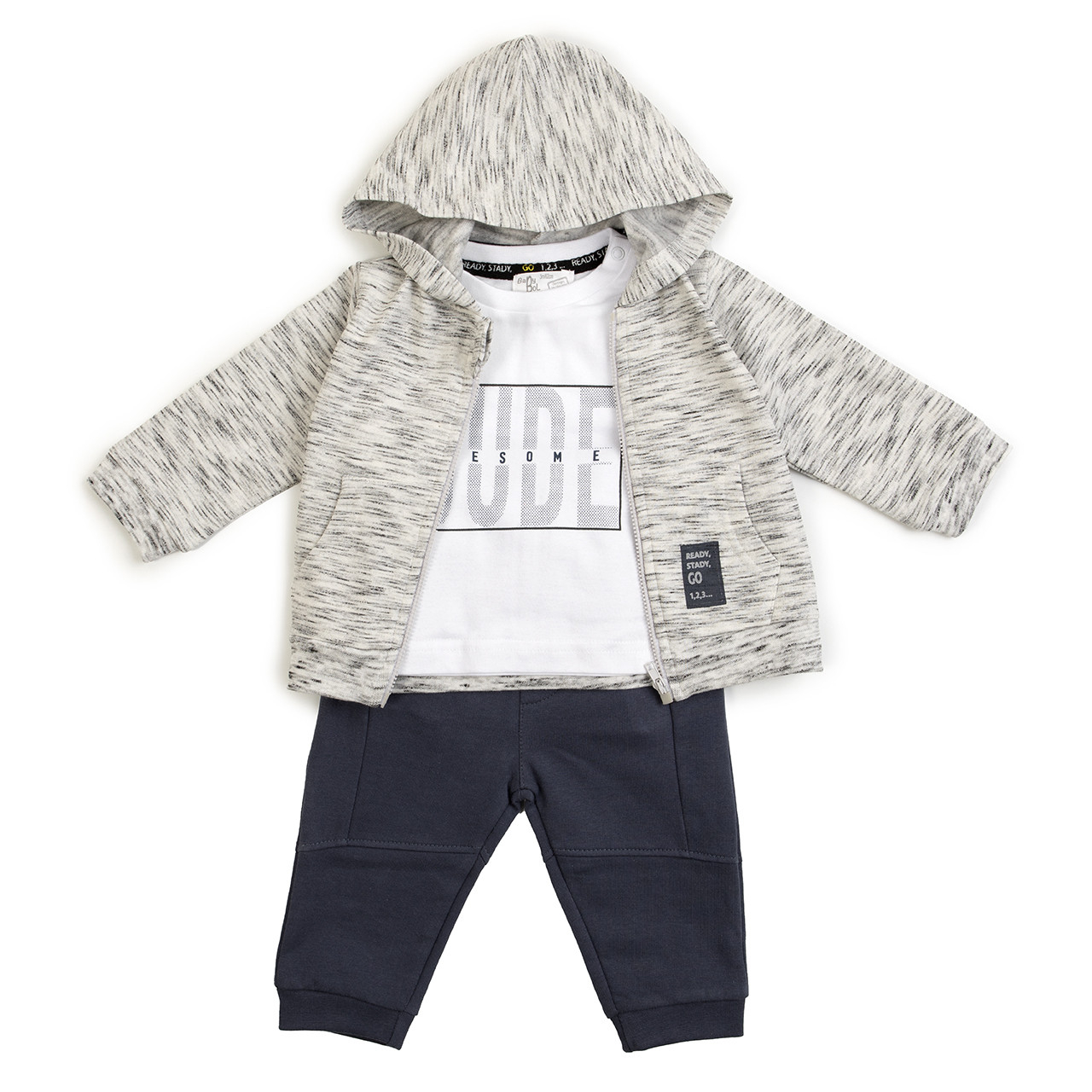 Trening bumbac 3 piese baiat Babybol, hanorac cu gluga cu deschidere pe fata cu fermoar, tricou maneca lunga si pantaloni cu siret in talie.