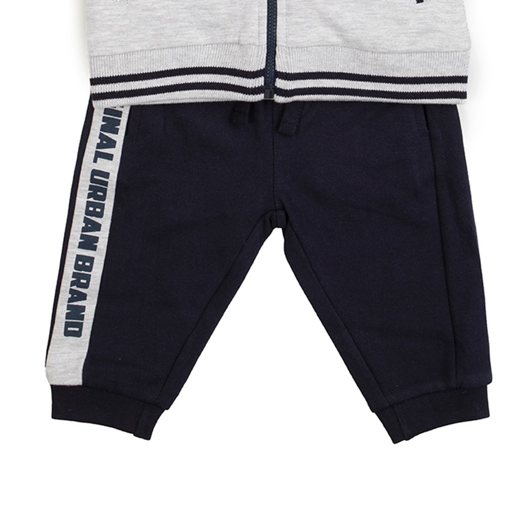 Trening 2 piese pentru baiat, vatuit la interior, compus din hanorac cu gluga culoare gri, deschidere pe fata cu fermoar, buzunare lateral si pantaloni trening navy, banda elastica si siret in talie. Brand Babybol Made Spania