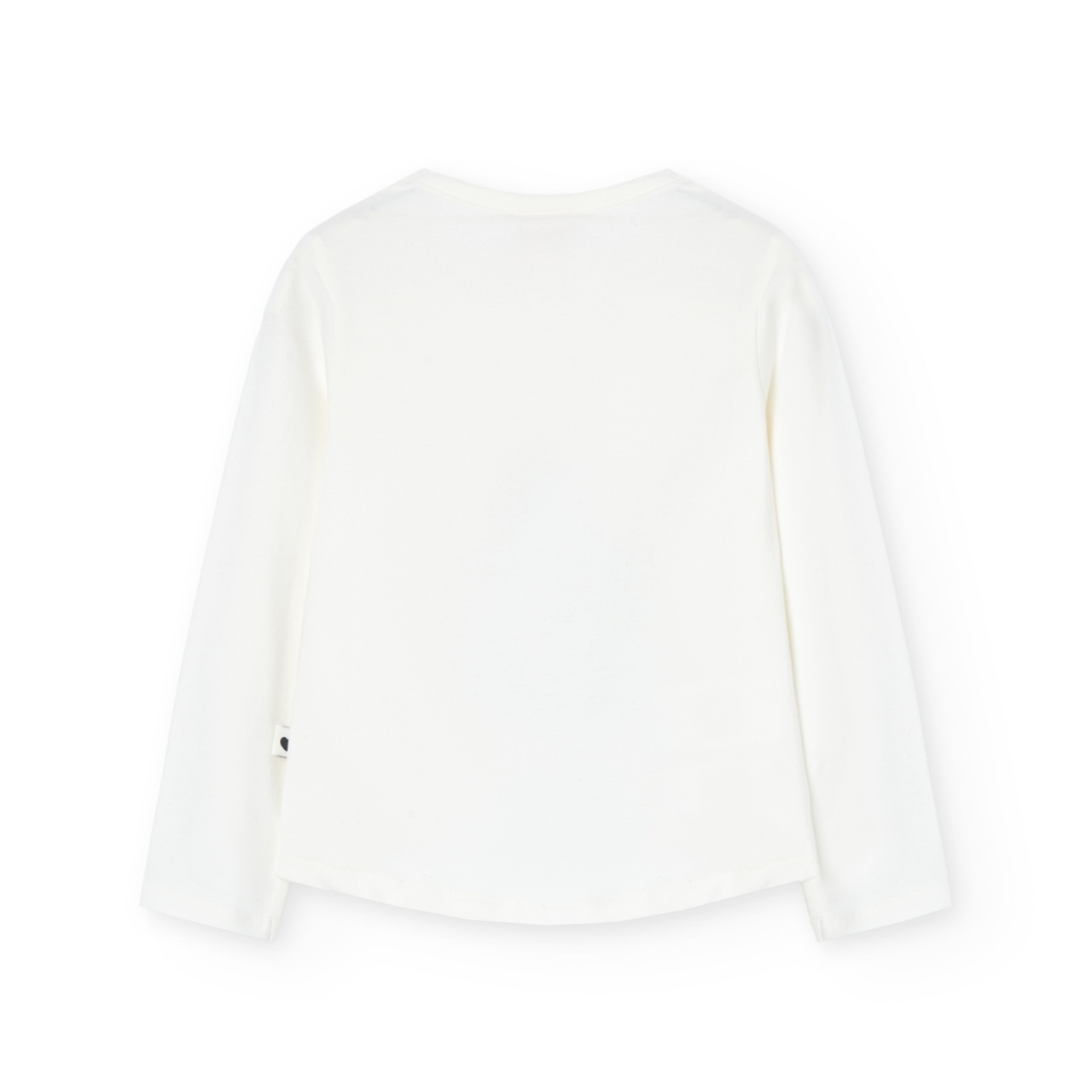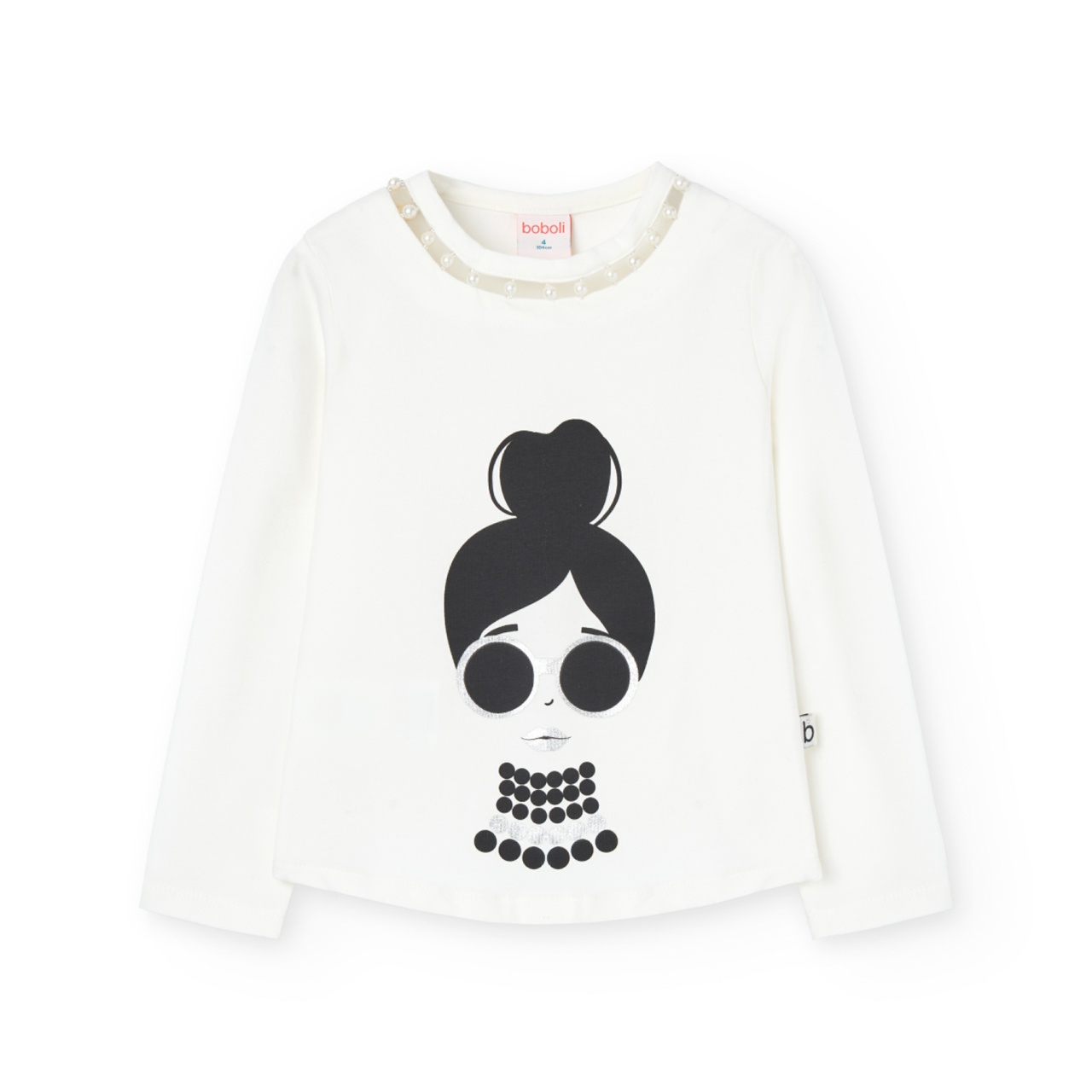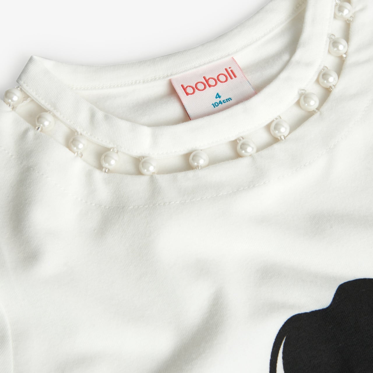 Tricou cu maneca lunga pentru fete 4-16 ani, ornat cu perle la guler, imprimeu grafic, material bumbac, certificare AMFORI si Better Cotton, brand BOBOLI.