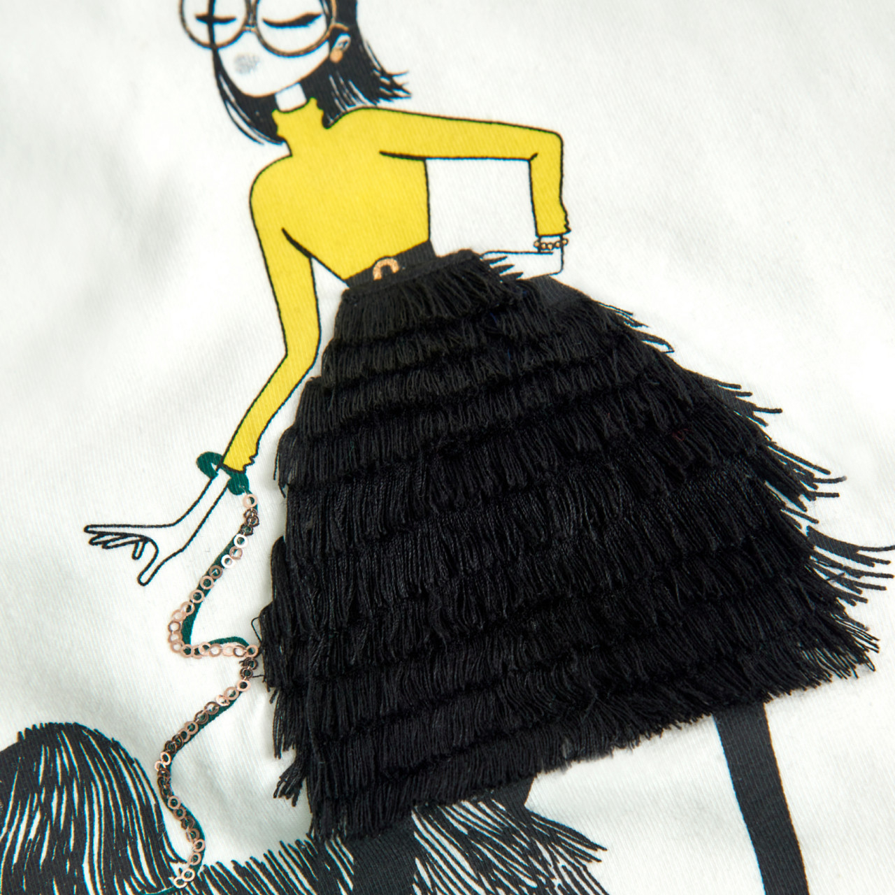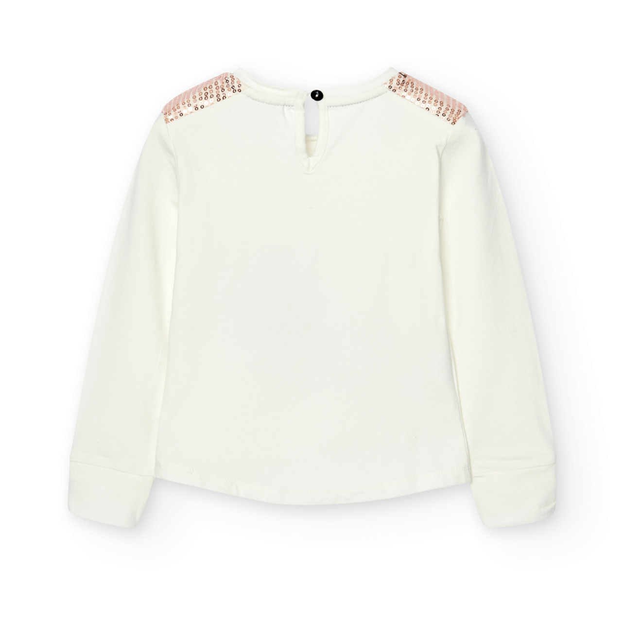 Tricou fete 4-16 ani din gama CHIC Boboli, maneca lunga, imprimeu fetita cu aplicatii, paiete pe umeri, bumbac, se inchide cu nasture ornamental.