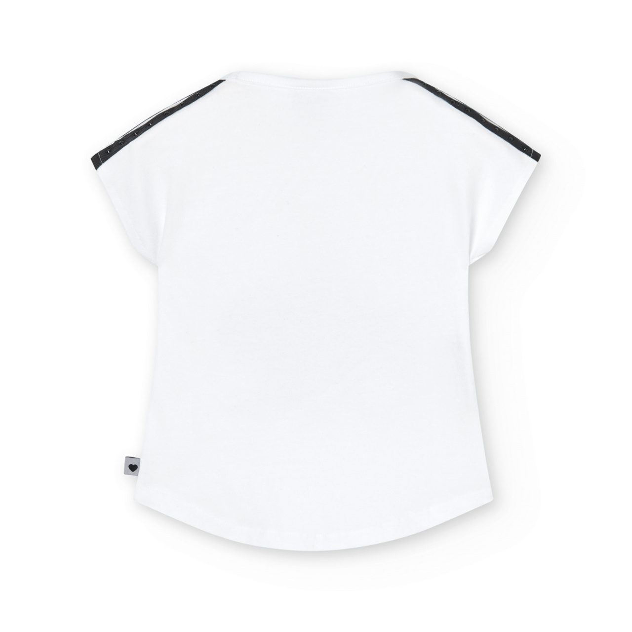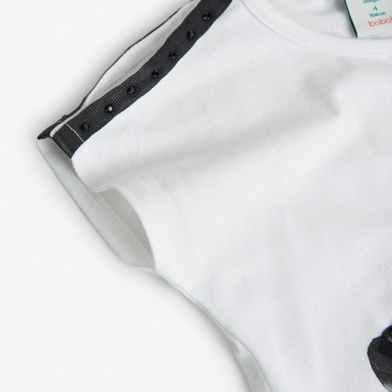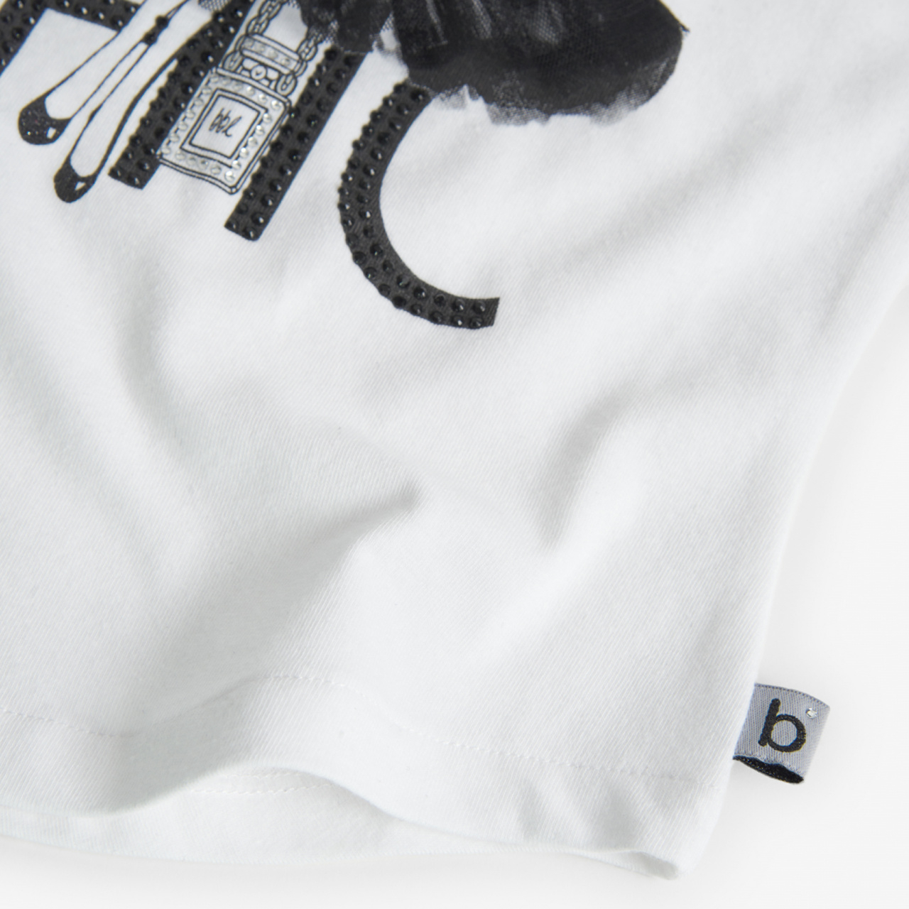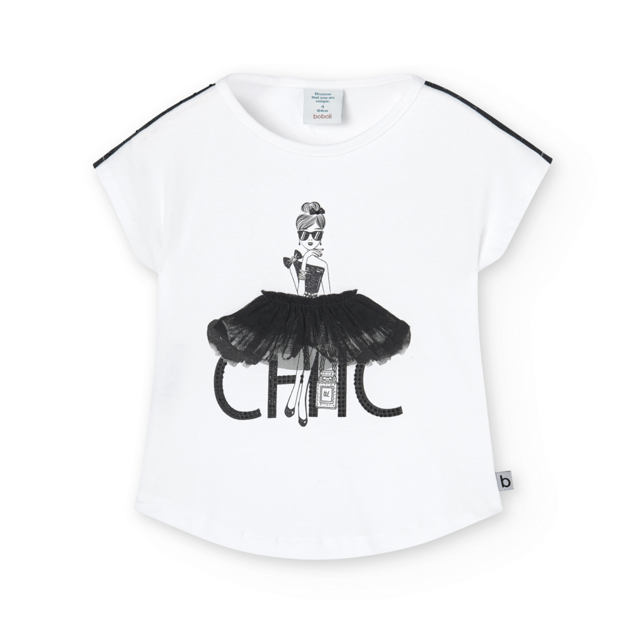 Tricou elegant fete 4-16 ani, imprimeu fetita cu fusta neagra, gama CHIC, strasuri, alb, brand BOBOLI.
