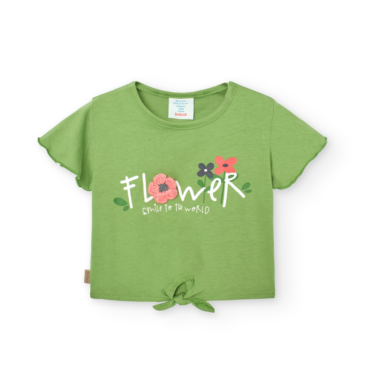 Tricou maneca scurta fete, bumbac better cotton, imprimeu floral, floare brodata aplicata, culoare verde, brand Boboli.